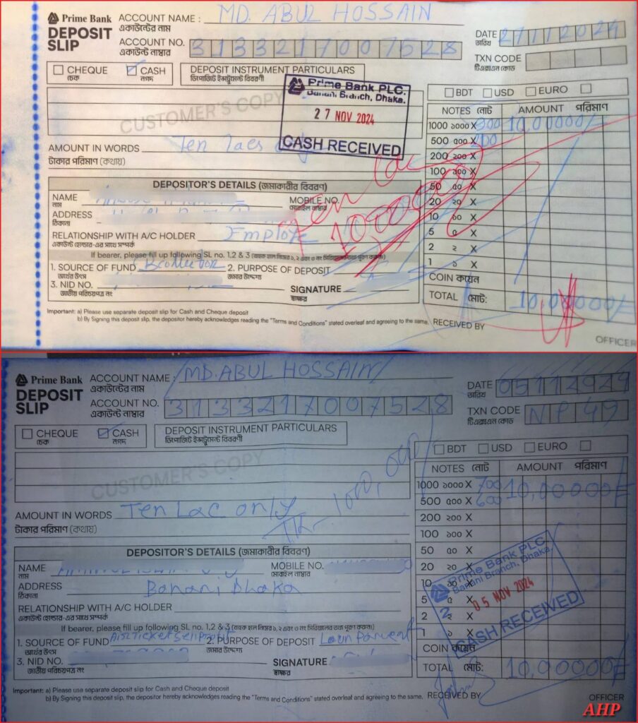 আইসিটির মামলা থেকে নাম বাদ দেয়ার কথা বলে একজনের থেকে এই অ্যাকাউন্টগুলোতে ২৫ লক্ষ টাকা নিয়েছে তাজুল গং। টাকা জমা দেয়ার রশিদ যুক্ত করা হলো। এটা জাস্ট ছোট্ট একটা স্যাম্পল। রাষ্ট্র চাইলে সহজেই এই একাউন্ট গুলোর ডিটেইলস বের করে দেখতে পারে এগুলো কাদের একাউন্ট, এগুলোতে কত টাকা কখন ঢুকেছে এবং পরবর্তীতে কারা সেই টাকা তুলে নিয়েছে। ছোট্ট একটা ক্লু দিলাম, চাইলে এটা থেকেই তাজুল গং এর দুর্নীতির অকাট্য প্রমাণ বের করা সম্ভব।