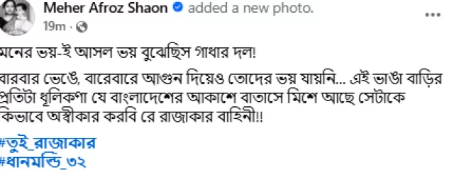 অভিনেত্রী শাওন ফেসবুকে লিখেছেন, ‘মনের ভয়-ই আসল ভয় বুঝেছিস গাধার দল! বারবার ভেঙে, বারেবারে আগুন দিয়েও তোদের ভয় যায়নি… এই ভাঙা বাড়ির প্রতিটা ধূলিকণা যে বাংলাদেশের আকাশে বাতাসে মিশে আছে সেটাকে কিভাবে অস্বীকার করবিরে রাজাকার বাহিনী!!’