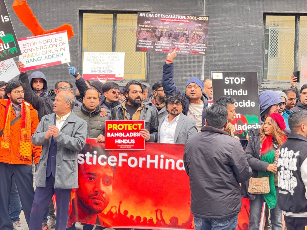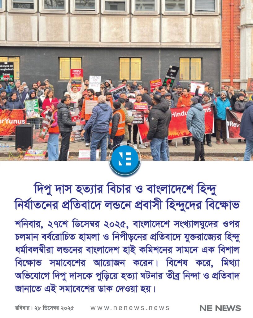 লন্ডন – শনিবার, ২৭শে ডিসেম্বর ২০২৫, বাংলাদেশে সংখ্যালঘুদের ওপর চলমান বর্বরোচিত হামলা ও নিপীড়নের প্রতিবাদে যুক্তরাজ্যের হিন্দু ধর্মাবলম্বীরা লন্ডনের বাংলাদেশ হাই কমিশনের সামনে এক বিশাল বিক্ষোভ সমাবেশের আয়োজন করেন। বিশেষ করে, মিথ্যা অভিযোগে দিপু চন্দ্র দাসকে পিটিয়ে ও পুড়িয়ে হত্যার ঘটনার তীব্র নিন্দা ও প্রতিবাদ জানাতে এই সমাবেশের ডাক দেওয়া হয়।