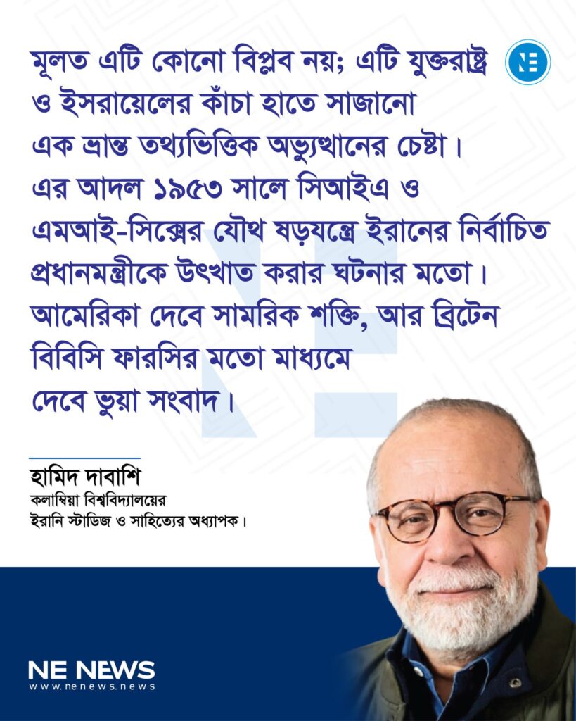 ইরানে গত দুই সপ্তাহ ধরে চলা গণবিক্ষোভ নিয়ে বাংলাদেশের শিক্ষিত সমাজ মোটা দাগে কয়েকটি ভাগে বিভক্ত। যার ফলে ইরান বিষয়ক খবর এবং বিবিধ এক পাক্ষিক মতামত আসায় প্রকৃত খবর পাওয়া যাচ্ছে না। যারা ২০২৪-এ বাংলাদেশে ডিপস্টেটের ষড়যন্ত্রকে ‘বিপ্লবটিপ্লব’ বলে আসছেন তারাই আবার ইরানের জনবিক্ষোভকে সমর্থন করতে পারছেন না, কারণ ইরানে আমেরিকা-ইসরায়েলের যোগসাজসকে বৈধ্যতা দিলে তারাও ওই পাপে পাপী প্রমাণিত হবেন। আবার মৌলবাদীদের ‘বস’ আমেরিকা তাদের প্রিয়ভাজন ইসলামি হুকুমতকে ধ্বংস করতে চাচ্ছে বলে গণবিক্ষোভ সমর্থন করছেন না, অথচ আমেরিকাকে সরাসরি সমালোচনাও করতে পারছেন না। এদিকে বিগত সরকারের সমর্থকরা ডিপস্টেটের ষড়যন্ত্রকে শেখ হাসিনা কঠোরভাবে দমন করতে না পারলেও খামেনি পারছেন বলে খামেনিদের ৪৬ বছরের বর্বর স্বৈরশাসন সমর্থন করে বসছেন।