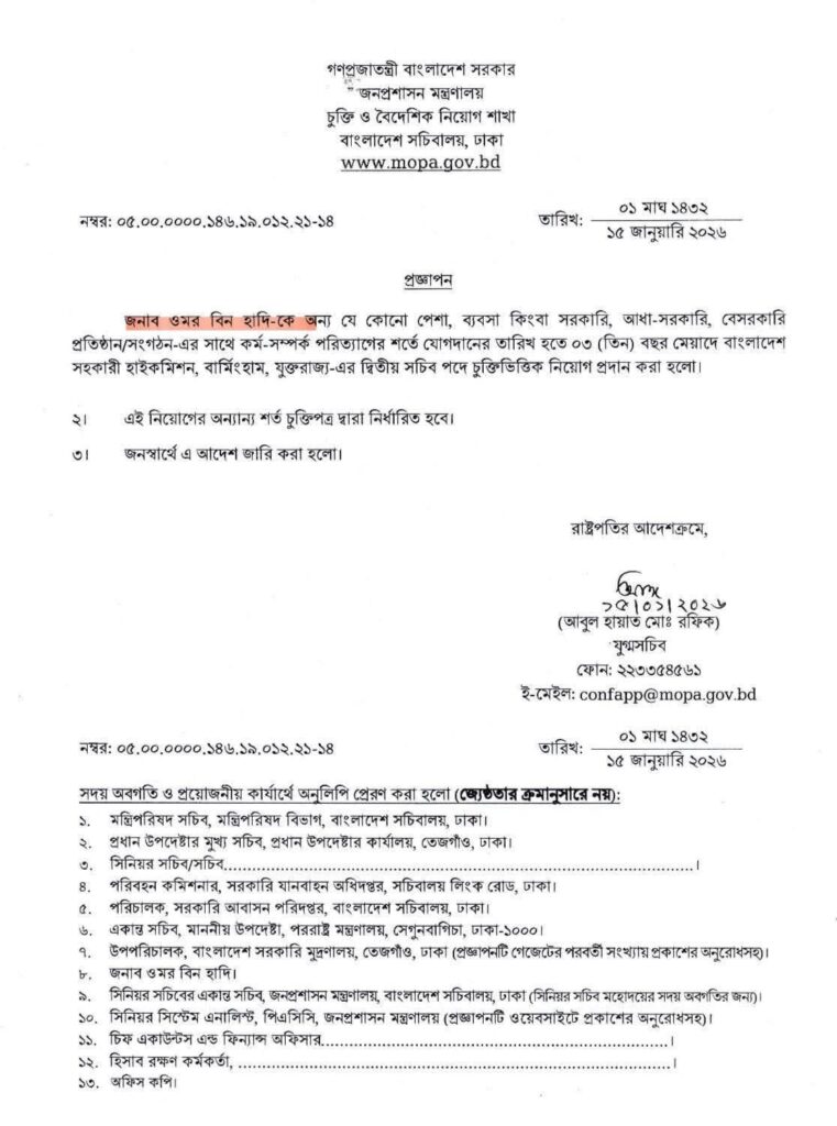 যুগ্মসচিব আবুল হায়াত মো. রফিক স্বাক্ষরিত ওই প্রজ্ঞাপনে বলা হয়েছে, ওমর বিন হাদিকে অন্য যে কোনো পেশা, ব্যবসা কিংবা সরকারি, আধা-সরকারি, বেসরকারি প্রতিষ্ঠান/সংগঠনের সঙ্গে কর্ম-সম্পর্ক পরিত্যাগের শর্তে যুক্তরাজ্যের বার্মিংহামে অবস্থিত বাংলাদেশ সহকারী হাইকমিশনে দ্বিতীয় সচিব পদে চুক্তিভিত্তিক নিয়োগ দেওয়া হলো।