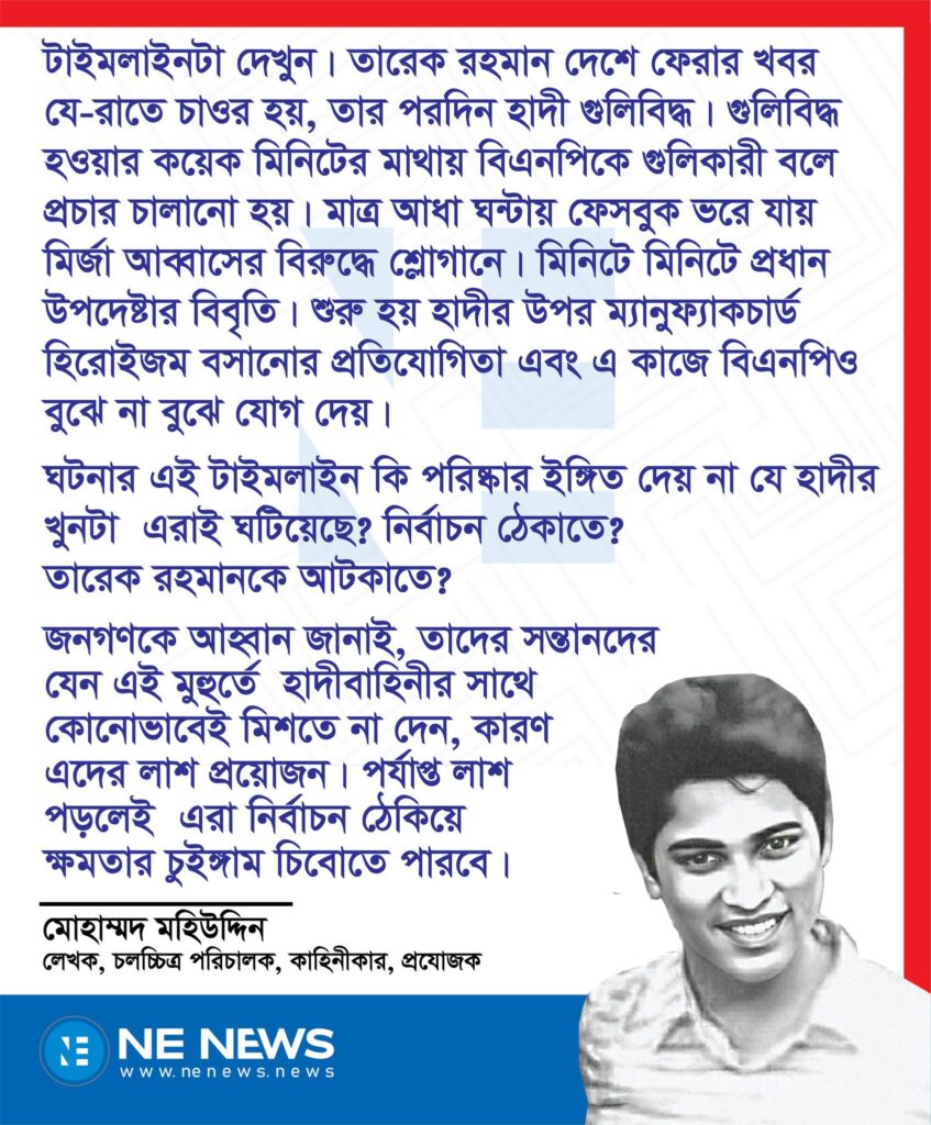 কিন্তু ডানপন্থী হাদী, গত দেড়বছরে হাদী, ফুয়াদ, হাসনাত এরা খোদ ঢাকা শহরের ভিন্নমতের মানুষদের স্তব্ধ করে দিয়েছে। খোদ ঢাকাবাসী কোন মেয়ে সন্ধ্যাবেলা তার একা চলাফেরা, তার পোশাক নিয়ে শংকিত হয়ে পড়েছে। কারণ চরম ডানপন্থী শক্তির উত্থান ঘটে গেছে। সেই হাদীর মৃত্যু, যে কোন মৃত্যু, হোক তা শত্রুর- তবু উল্লাস করা বর্বরতা। কিন্তু একটা দেশকে চরমমাত্রায় মব ভায়োলেন্স দিয়ে আক্রান্ত করা কারোর মৃত্যু দেশের জন্য ঠিক কিসের ক্ষতি?