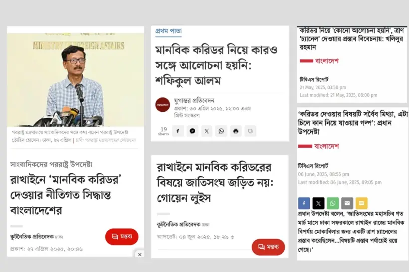 ২১ মে: জাতীয় নিরাপত্তা বিষয়ক উপদেষ্টা খলিলুর রহমান টিবিএস নিউজ বাংলাকে বলেন, “বাংলাদেশ ‘করিডোর’ নিয়ে কারও সঙ্গে আলোচনা করেনি। তবে বাংলাদেশের ভেতর দিয়ে ত্রাণ সরবরাহের একটি ‘চ্যানেল’ তৈরির জাতিসংঘের প্রস্তাব বাংলাদেশ বিবেচনা করছে।” এখানে ‘করিডোর’ এর বদলে ‘চ্যানেল’ শব্দটি ব্যবহার করা হয়, যা বিষয়টিকে আরও ঘোলাটে করে তোলে। তথ্যসুত্রঃ দি বিজনেস স্ট্যান্ডার্ড বাংলা, ২১ মে ২০২৫।