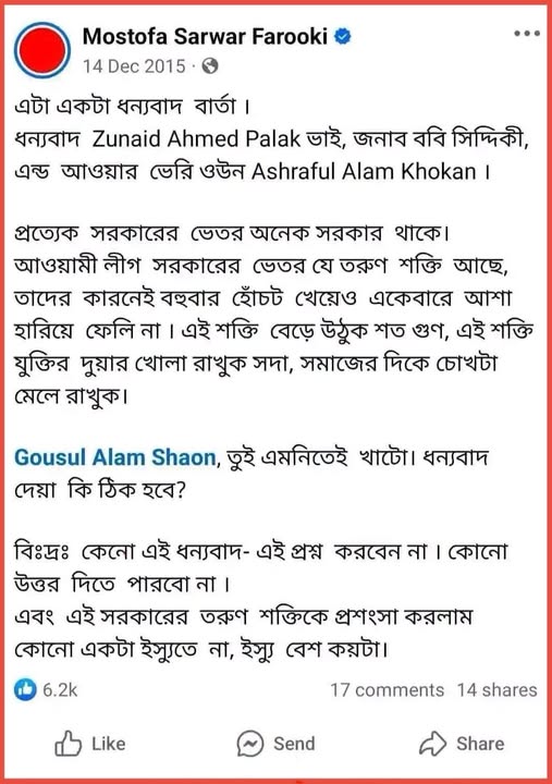 মঙ্গলবার (৭ অক্টাবর) ফারুকীর একটি পুরোনো ফেসবুক পোস্টের স্ক্রিনশট দিয়ে পোস্ট করেন শাওন। যেখানে তৎকালীন আওয়ামী লীগ সরকারের তরুণ নেতৃত্বদের প্রশংসা করতে দেখা গেছে ফারুকীকে। ১০ বছর আগের অর্থাৎ ২০১৫ সালের ১৪ ডিসেম্বর সেই পোস্টে ফারুকী লিখেছিলেন, ‘এটা একটা ধন্যবাদ বার্তা। ধন্যবাদ জুনায়েদ আহমেদ পলক ভাই, জনাব ববি সিদ্দিকী, এন্ড আওয়ার ভেরি ওউন আশরাফুল আলম খোকন। প্রত্যেক সরকারের ভেতর অনেক সরকার থাকে। আওয়ামী লীগ সরকারের ভেতর যে তরুণ শক্তি আছে, তাদের কারনেই বহুবার হোঁচট খেয়েও একেবারে আশা হারিয়ে ফেলি না। এই শক্তি বেড়ে উঠুক শত গুণ, এই শক্তি যুক্তির দুয়ার খোলা রাখুক সদা, সমাজের দিকে চোখটা মেলে রাখুক। গাউসুল আলম শাওন, তুই এমনিতেই খাটো। ধন্যবাদ দেয়া কি ঠিক হবে?’