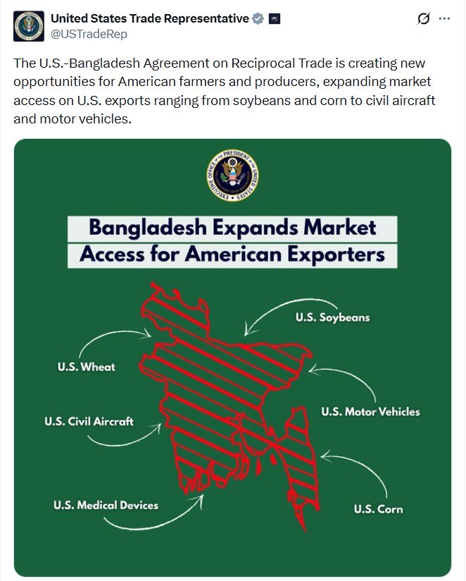 ৪। বাংলাদেশ যুক্তরাষ্ট্রের শিল্প ও কৃষি পণ্যের যেমন: গরুর মাংস, পোল্ট্রি, দুগ্ধজাত পণ্য, এবং রাসায়নিক সারের জন্য বাজার উন্মুক্ত করতে রাজি হয়েছে। এর ফলে বাংলাদেশের স্থানীয় ডেইরি ও পোল্ট্রি শিল্প এবং প্রান্তিক কৃষকরা হুমকির মুখে পড়ল।