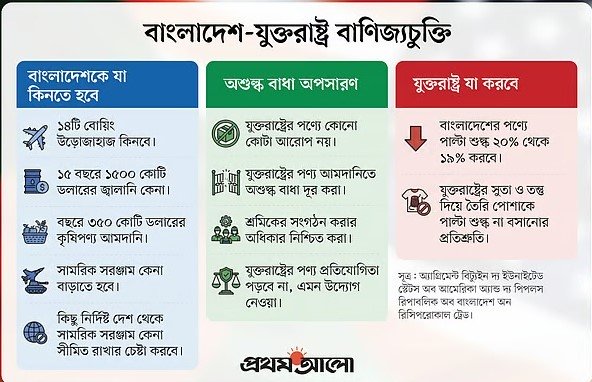 ৩। শুল্ক সামান্য কমানোর বিনিময়ে বাংলাদেশকে আগামী ১৫ বছরে যুক্তরাষ্ট্র থেকে প্রায় ১৫ বিলিয়ন ডলারের জ্বালানি পণ্য এবং ৩.৫ বিলিয়ন ডলারের কৃষি পণ্য কেনার প্রতিশ্রুতি দিতে হয়েছে। যার ফলে এই পণ্য অন্য কোনো দেশ থেকে সস্তায় পেলেও কেনা যাবে না।
