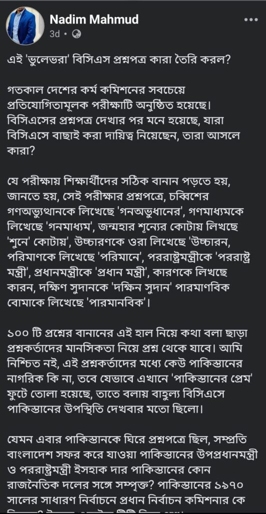 ‘এমসিকউ টাইপ লিখিত পরীক্ষার প্রশ্নের বানানের এই হাল নিয়ে কথা বলা ছাড়া প্রশ্নকর্তাদের মানসিকতা নিয়ে প্রশ্ন থেকে যাবে। আমি নিশ্চিত নই, এসব প্রশ্নকর্তার কেউ পাকিস্তানের নাগরিক কি না, তবে যেভাবে এখানে ‘পাকিস্তানের প্রেম’ ফুটিয়ে তোলা হয়েছে, তাতে বলাই বাহুল্য যে বিসিএসে পাকিস্তানের উপস্থিতি দেখার মতো ছিল। যেমন এবার পাকিস্তানকে ঘিরে প্রশ্নপত্রে ছিল, সম্প্রতি বাংলাদেশ সফর করে যাওয়া পাকিস্তানের উপপ্রধানমন্ত্রী ও পররাষ্ট্রমন্ত্রী ইসহাক দার পাকিস্তানের কোন রাজনৈতিক দলের সঙ্গে সম্পৃক্ত? পাকিস্তানের ১৯৭০ সালের সাধারণ নির্বাচনে প্রধান নির্বাচন কমিশনার কে ছিলেন? ছিল ইন্দাস ওয়াটার ট্রিটি নিয়ে প্রশ্ন।’